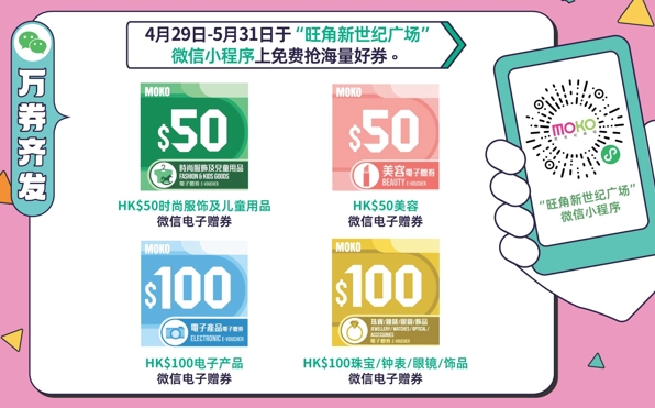 旅程未启,优惠先行,为方便内地旅客一站式购齐心仪好物,4月29日至5月31日期间,MOKO在"旺角新世纪广场"微信小程序内推出多款赠券,包括HK$50时尚服饰及儿童用品微信电子赠券、HK$50美容微信电子赠券、HK$100电子产品微信电子赠券、HK$100珠宝/钟表/眼镜/饰品微信电子赠券,旅客可免费领取后到指定商户使用,让购物更加轻松实惠。