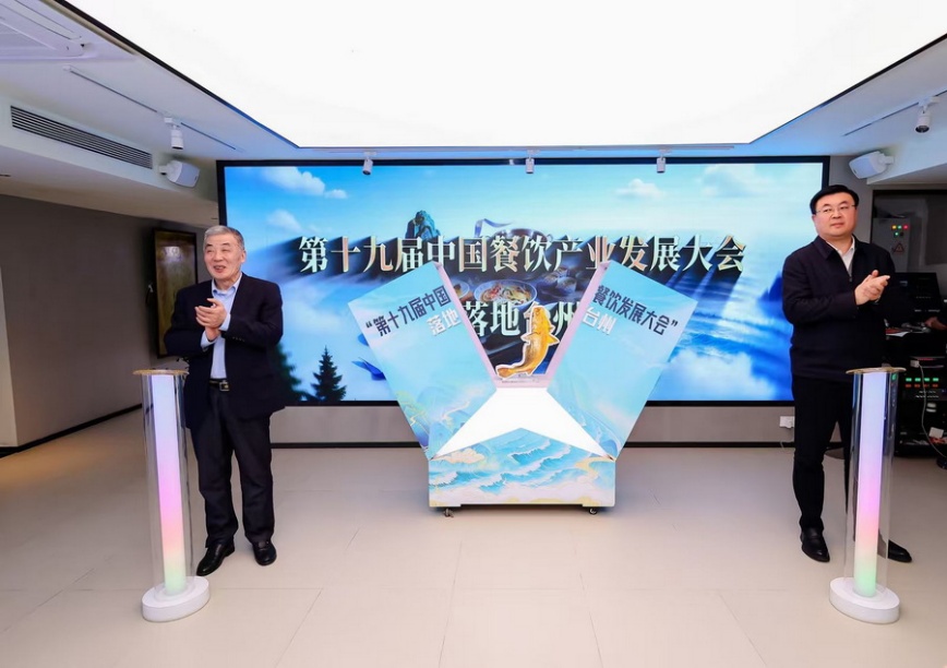 中国烹饪协会副会长乔杰、台州市政府副市长程炜博为第十九届中国餐饮产业发展大会落地台州上台启动(中国烹饪协会供图)
