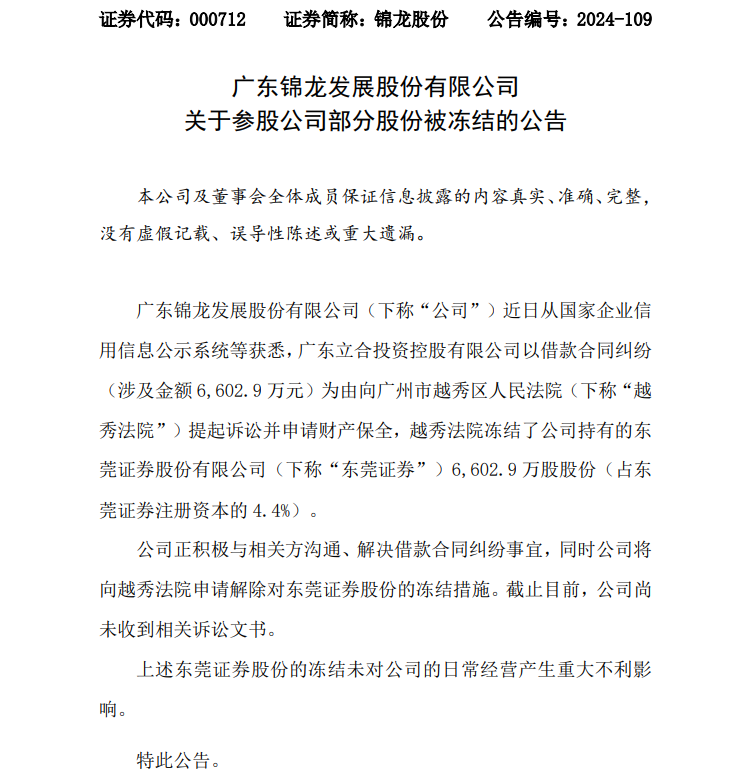 12月15日晚间,锦龙股份公告,因借款合同纠纷,广东立合投资控股有限公司(下称“立合投资”)向广州市越秀区人民法院(下称“越秀法院”)提起诉讼并申请财产保全,导致锦龙股份所持东莞证券6603万股股份被冻结。