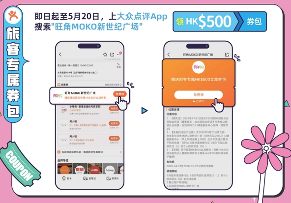 即日起至5月20日期间,內地旅客可于大众点评App搜索“旺角MOKO新世纪广场”免费领取HK$500旅客专属券包,包括总值HK$400时尚服饰及儿童用品微信电子赠券及HK$100美容微信电子赠券。MOKO汇聚众多时尚服饰及美容品牌,无论是添置新装还是入手美妆好物,都有丰富选择,旅客在出发前提前锁定优惠,到港后直接享受,进一步提升出行体验。